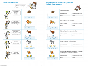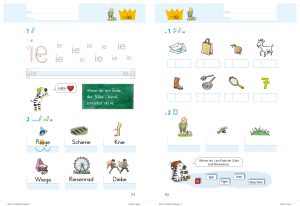 - Es folgt eine Aufgabe der visuellen Diskriminierung, in der der jeweilige Buchstabe in einem kurzen netten Text entweder eingekreist oder in einem Bildteil ausgemalt werden soll. Bei schwierigeren Buchstaben und –verbindungen müssen vorgegebene Wörter abgeschrieben oder einem Bild zugeordnet werden.