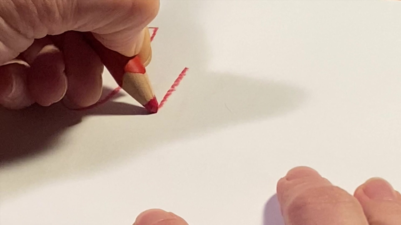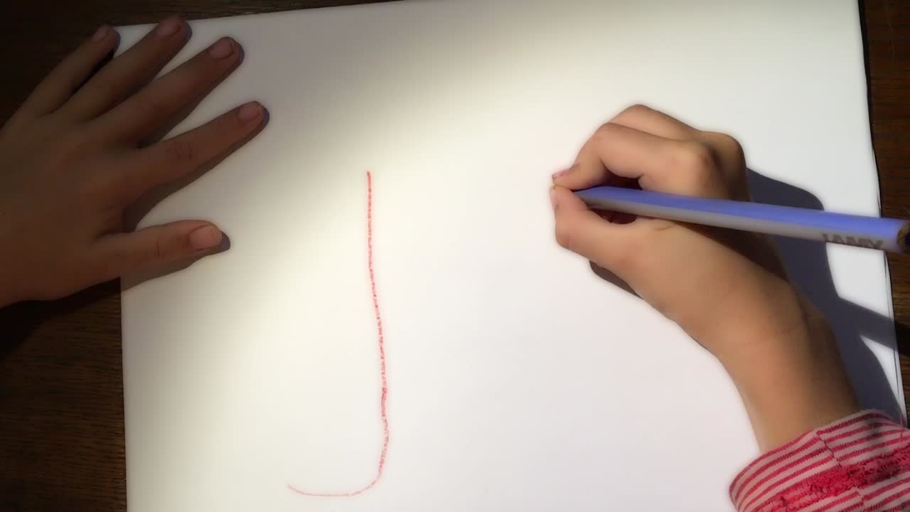 Schreibanweisung im Film: Strich bis ganz nach unten, Schwung nach links (J). Strich nach unten und Pünktchen darüber (j).