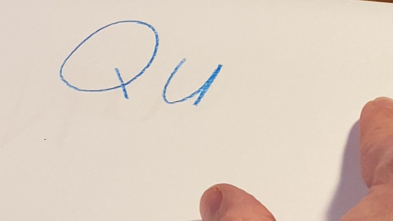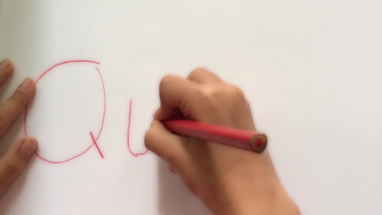 großes Q: Großer Kreis, kleiner Strich unten rechts. u: Nach unten, Kurve, hoch und ab.