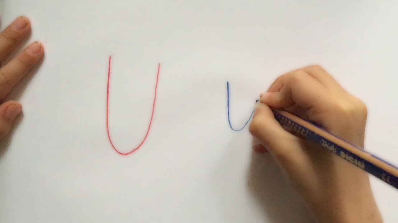 Schreibanweisung im Film: Nach unten, Kurve, hoch (U). Nach unten, Kurve, hoch und ab (u).