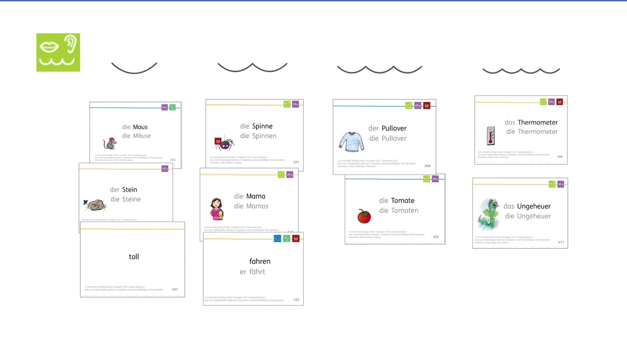 Dabei sind die Karten handlungsorientierter als Wortlisten: Einzelne Kärtchen sind jederzeit austauschbar, beispielsweise wenn ein bestimmtes Wortmaterial gefestigt ist, und können ggf. später zur Wiederholung bereitgehalten werden.