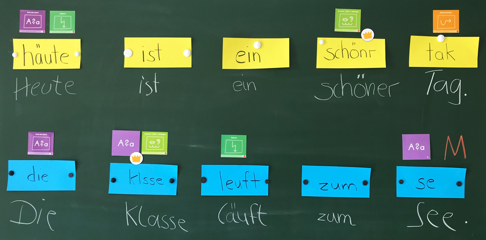 Für einen „Chaos-Satz“ werden die Wortkarten ungeordnet an die Tafel gehängt. Ein Schüler ordnet die Wörter zu einem Satz an. Nun berichtigen einzelne Schüler Wort für Wort den „Chaos-Satz“. Hilfestellungen geben dabei die Tipp-Karten, die Strategie-Poster, ich als Lernmoderator und/oder das FRESCH-Wörterbuch. Die Schüler nennen jeweils die Strategie(n), die sie zur Berichtigung nutzen und hängen den passenden Tafelmagnet über das Wort. Das berichtigte Wort schreiben sie unter die Wortkarte.