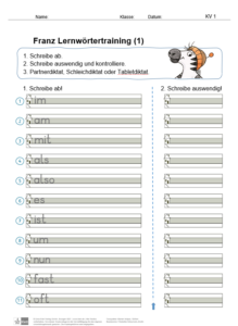 Das erste Franz Zebra Lernwörtertraining (1) umfasst 11 Häufigkeitswörter und die folgenden Trainingseinheiten 2-5 enthalten jeweils 10 Wörter. Franz Lernwörtertraining (1) kann bereits nach der Bearbeitung des Buchstabenheftes Plus Teil A eingesetzt werden. Zu diesem Zeitpunkt sind die Kinder in der Schule angekommen und mit der Arbeitsweise des Buchstabenheftes Plus vertraut. Weiterhin haben die Schülerinnen und Schüler wichtige Methoden zum Lesen- und Schreibenlernen kennengelernt und können nun nach und nach in die Arbeit mit dem Grundwortschatz eingeführt werden.