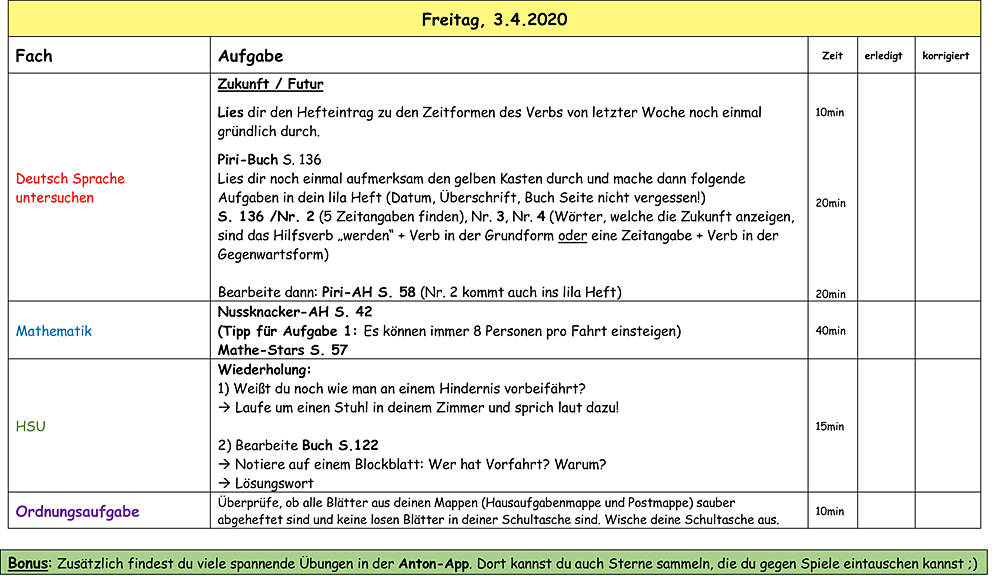 Die meisten Lehrkräfte helfen ihren Schülern beim Lernen zu Hause durch einen Wochenplan. Dabei ist für mich sehr wichtig, dass er ausführlich ist. Nicht der kurze, knappe Plan, der aussieht, als wäre er schnell abgehandelt, sondern ein großer, ausführlicher Plan ist es bei mir geworden und ich bin der festen Überzeugung, dass der meiner Klasse am besten hilft. Im Plan verlinke ich auch Erklärvideos aus dem Internet, verweise auf bestimmte Heft- und Buchseiten und schreibe Erklärungen auf, die so auch als Hefteintrag dienen können. Mir ist es ein Anliegen, neben den Kernfächern auch stets Material für Musik, Kunst und Englisch bereitzuhalten. Diese Fächer bereiten den Kindern erfahrungsgemäß sehr viel Spaß und sollten auch im Wochenplan nicht ausgespart werden. Der Plan ist nach Tagen und Fächern strukturiert und dabei ist ein wichtiger Bestandteil auch die Planbarkeit: Jede Aufgabe ist für einen bestimmten Tag eingeplant, das gilt es auch genau zu befolgen, weil die Bereiche aufeinander aufbauen.