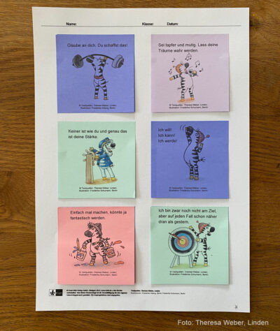 Ich bin mir ganz sicher, dass diese kleinen „Zettelchen“ eure Schülerinnen und Schüler zebramäßig unterstützen werden. Sicherlich freut sich eure Zebraherde über die eine oder andere Botschaft im Schreibheft, Lesebuch oder auf einem Arbeitsblatt. Die neuen Bewegungstipps klebe ich auch einfach gerne auf den Lernzeitplan. Kreative Umsetzungsmöglichkeiten, gerade für kleine Bewegungspausen zwischendurch, finden sich zu Hauf. Hier können sich sogar die mitlesenden Mamas und Papas austoben.