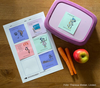 Meine Große war total gerührt, als sie zur Frühstückspause ihr Lieblingszebra mit der Nachricht „Ich habe dich lieb“ auf ihrer Brotdose fand. Die neuen Fitness-Ideen unterstützen sie jetzt beim Lernen und bei den Hausaufgaben. Ihr Papa startete mit der Empfehlung „Sei immer du selbst. Außer du kannst ein Zebra sein. Dann sei ein Zebra.“ sehr amüsiert in den Tag. Mittlerweile sieht man ihn nun immer mal auf einem Bein durchs Haus hüpfen. Dann hat unsere Kleine wieder eine neue kreative Möglichkeit gefunden, die klebenden Botschaften zu platzieren.