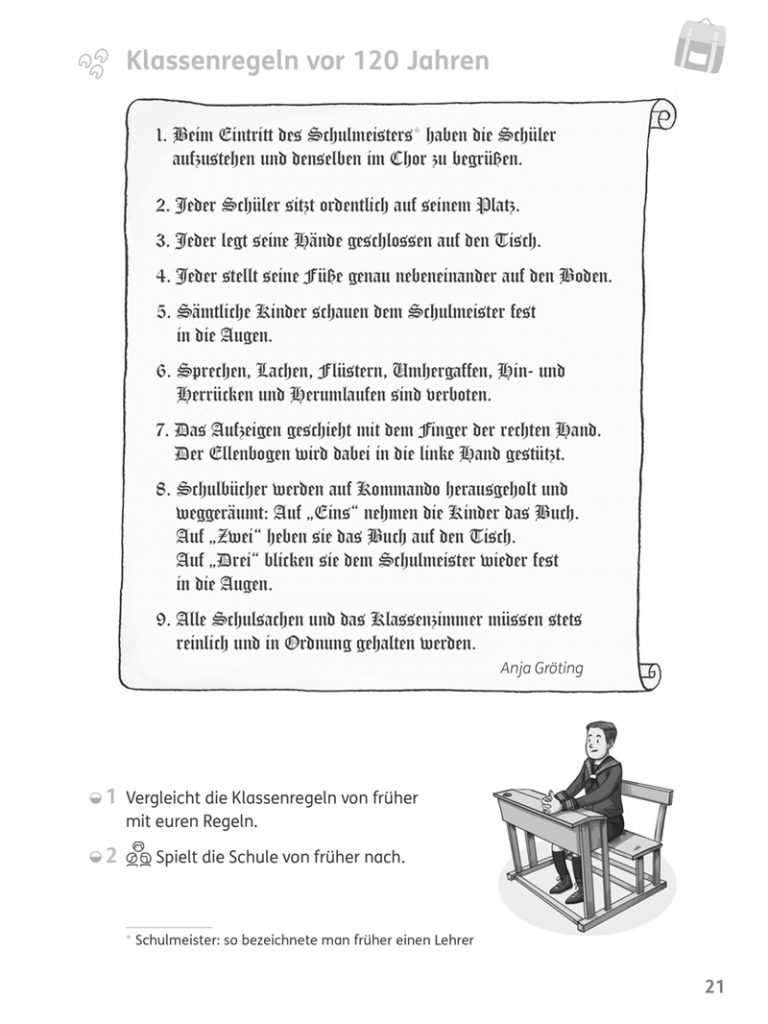 In der sich daran anschließenden Werkstattarbeit vertieften die Kinder die im Gruppenpuzzle gewonnenen Erkenntnisse und probierten vieles praktisch aus. Höhepunkt war der Besuch eines alten Klassenzimmers, in dem die Kinder eine Schulstunde nach der „Klassenordnung vor 100 Jahren“ – ebenfalls aus dem ZEBRA Lesebuch 3 – selbst erlebten
