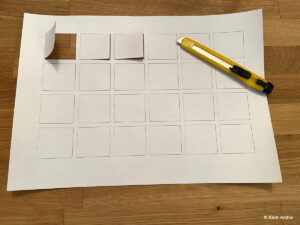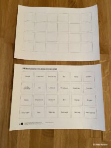 Aus 3 DIN A4 Papierseiten können die Kinder z.B. 24 Kalenderblätter an den Faltlinien ausschneiden und jedes Kalenderblatt mit Worten und/oder Bild gestalten. Auf der Vorderseite wird groß die Zahl (1-24) markiert, auf die Rückseite kommt Text oder Motiv. Das DIN A4 Blatt wird 3x gefaltet und dabei immer halbiert. So entstehen 8 Flächen zum Ausschneiden.