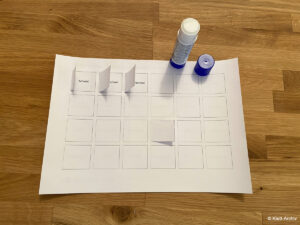 Um einen „Türchen-Kalender“ zu basteln, brauchen die jüngeren Grundschulkinder Hilfe. Ein DIN A4 – Bogen ist die Grundlage, auf einem 2. DIN A4 Bogen werden 24 Türchen eingezeichnet und an 3 Seiten aufgeschnitten. Dieser Bogen wird an den Rändern auf das Blanko-Blatt aufgeklebt.
