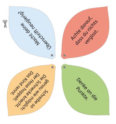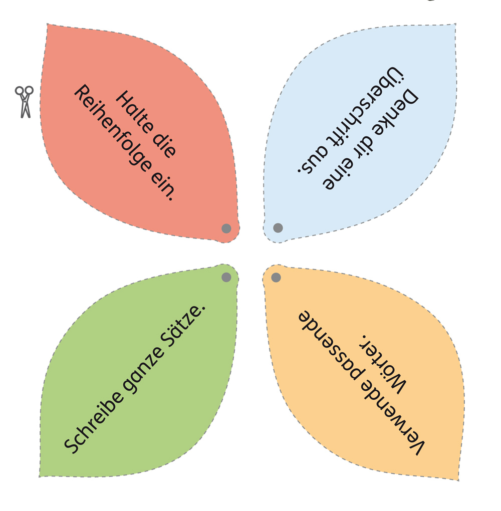 Die Schreibblume unterstützt die Kinder beim Verfassen von Texten. Im Arbeitsheft Lesen/Schreiben 2 werden auf den einzelnen Blütenblättern zunächst grundlegende Tipps zum Schreiben eigener Texte aufgeführt, die in den folgenden Jahrgangsstufen aufgegriffen und ausgebaut werden. Die Schreibblume besteht aus vier verschiedenfarbigen Blütenblättern. Auf der Vorderseite finden die Kinder jeweils einen Schreib-Tipp und auf der Rückseite einen weiteren Tipp.