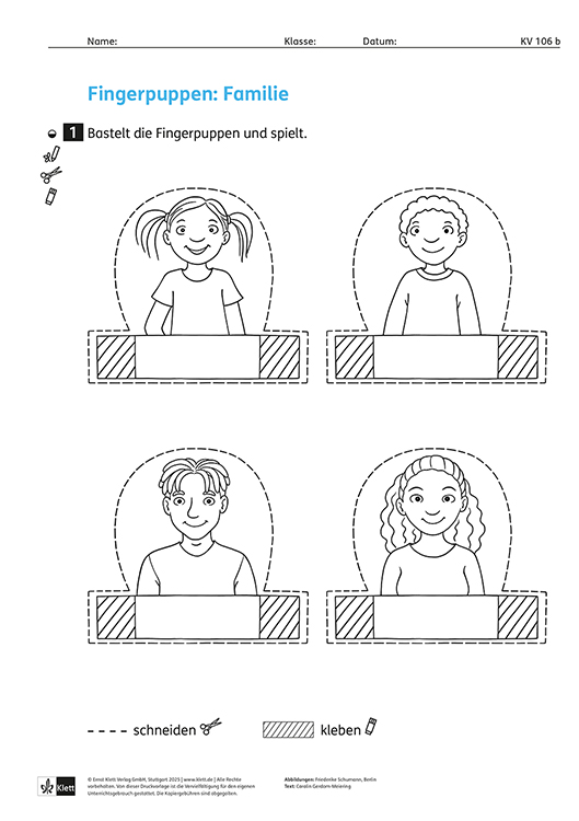Mit Kopiervorlage 106 könnt ihr euch sogar euren eigenen Zebra Franz und unserer Familie aus dem Zebra DaZ Arbeitsheft Alphabetisierung als Fingerpuppe basteln. Besonders schüchternen Kindern hilft die Möglichkeit quasi „für jemand anderen“ zu sprechen erfahrungsgemäß besonders und außerdem bringt es eine Menge Spaß, sich mit den individuell bemalten Puppen auf dem Finger durch die Klasse zu bewegen und Dialoge zu führen.
