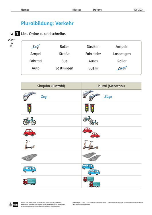 Mithilfe von Aufgaben zum Verbinden, Lesen, Malen und Schreiben wird der Wortschatz geübt, mit den Artikeln in Bezug gesetzt und auf die Pluralform erweitert.