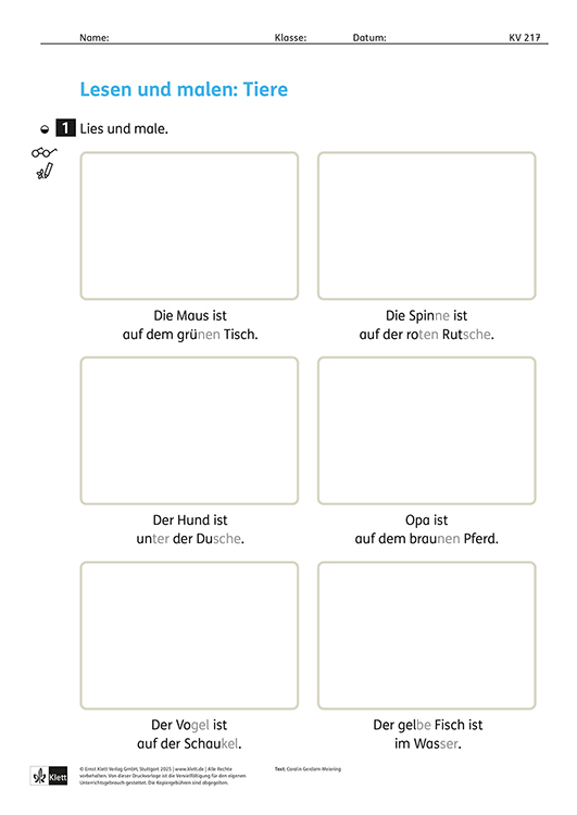 Je nach Thema gibt es weitere Kopiervorlagen bspw. Farbdiktate für die Arbeit zu zweit oder Schreibaufgaben, bei denen das eigene Zimmer oder die Familie gemalt und beschrieben werden kann. Bastelvorlagen für eine eigene Wetteruhr sind ebenfalls dabei.