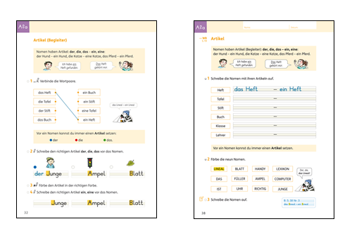 Den „Artikel“ versehen wir im Förderheft mit der aus Klasse 1 noch bekannten Erklärung „(Begleiter)“. Während in der Basisausgabe in Aufgabe 1 die Nomen eigenständig mit bestimmtem und unbestimmtem Artikel verschriftet werden, verbinden Förderkinder die vorgegebenen Wörter.