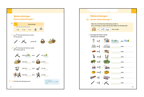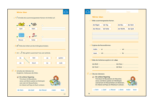 Vergleichen wir die beiden „Wörter-üben“-Seiten im Bereich Wortbausteine, dann fällt auf, dass bei Aufgabe 1 beide Male Nomen zusammengesetzt werden – in der Fördervariante aber visuell gestützt durch Bilder und Artikelpunkte. Statt Personalformen selbst zu bilden, konzentrieren sich Förderkinder auf die richtige Zuordnung durch Verbinden (und dem vorangestellt durch Erlesen der Wortkarten).