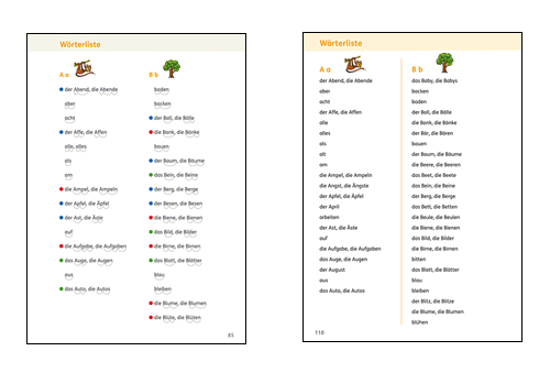 In der Wörterliste des Förderheftes haben wir zur Unterstützung zu allen Wörtern Silbenbögen eingebaut, um Kindern mit Förderbedarf Hilfen zu Aufgaben zu geben, bei denen Silben bzw. das Schwingen und Weiterschwingen essentiell ist. Ebenfalls enthalten sind bei allen Nomen die Artikelpunkte zur Visualisierung. Außerdem haben wir die Wörterliste an die Inhalte des Heftes angepasst.