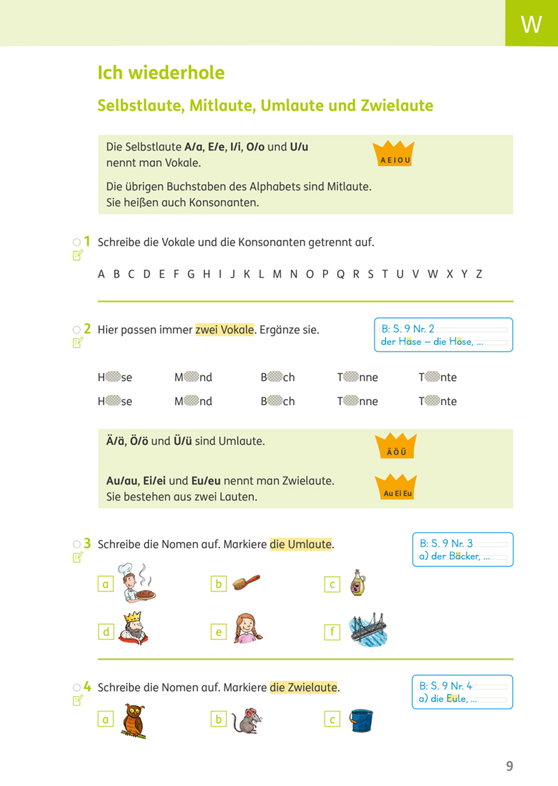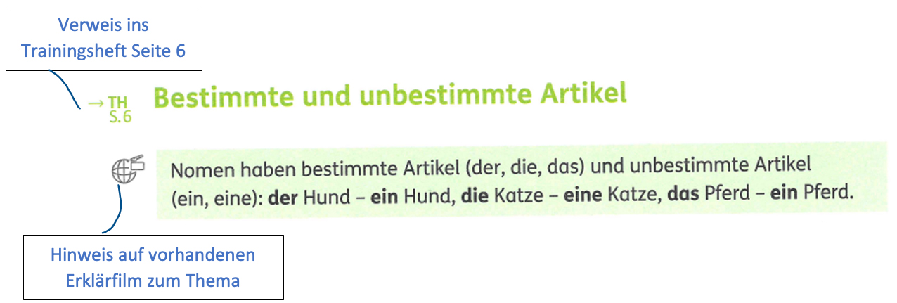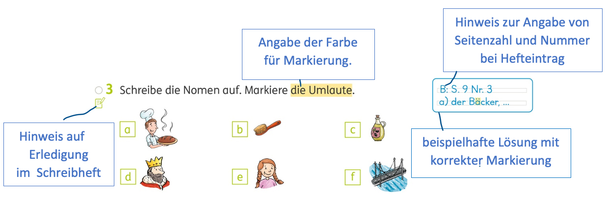 - Verweise zu den Arbeitsheften „Sprache“ und „Lesen/Schreiben“.