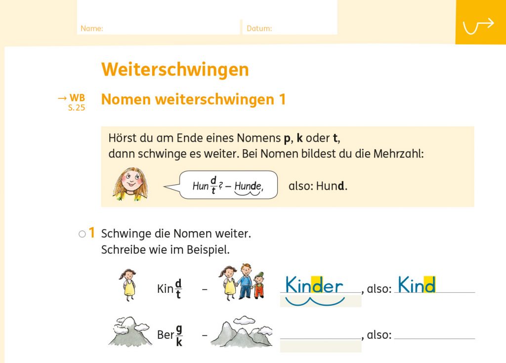Um herauszufinden, ob Wörter eine Auslautverhärtung aufweisen, können diese weitergeschwungen werden. Um herauszufinden, ob Wörter mit dem Umlaut ä/äu oder mit e/eu geschrieben werden, müssen weitere Wörter der Wortfamilie abgeleitet werden. Hierzu bieten sich die Strategien des Weiterschwingens und des Ableitens an. In beiden Fällen werden Wörter einer Wortfamilie eruiert und miteinander verglichen.