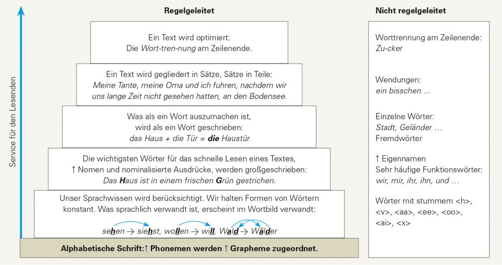 Abb.: Grundlagen der deutschen Orthographie: Die einzelnen Rechtschreibbereiche (als Pyramide), Rechtschreibrahmen Baden-Württemberg, S. 10. Weitere Informationen sind hier abrufbar.