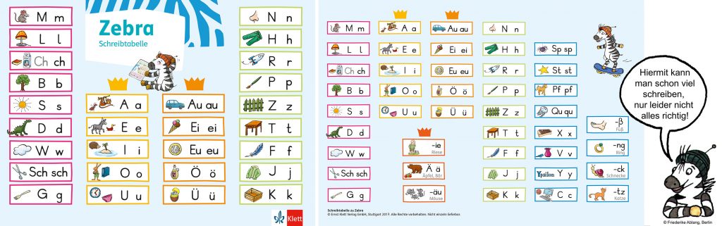 Abb.: Die Zebra Schreibtabelle. Kernstück für den Erwerb regelgeleiteter, auf dem alphabetischen Prinzip beruhender Schreibungen (siehe auch : Das Konzept der Zebra-Schreibtabelle 2018)