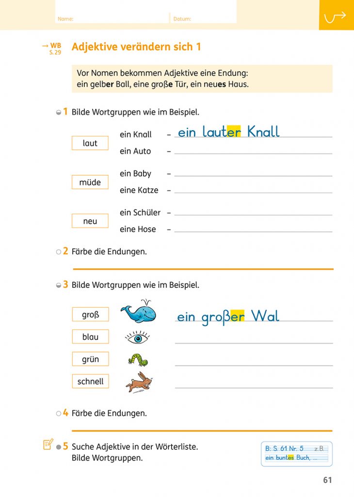 Die Kinder erfahren, dass Adjektive im Zusammenhang mit Nomen stehen: „Adjektive beschreiben, wie Lebewesen oder Dinge sind.“ Stehen Adjektive vor Nomen, ändert sich die Endung. Um zu prüfen, ob es sich bei einem Wort um ein Adjektiv handelt, können die Kinder so vorgehen: