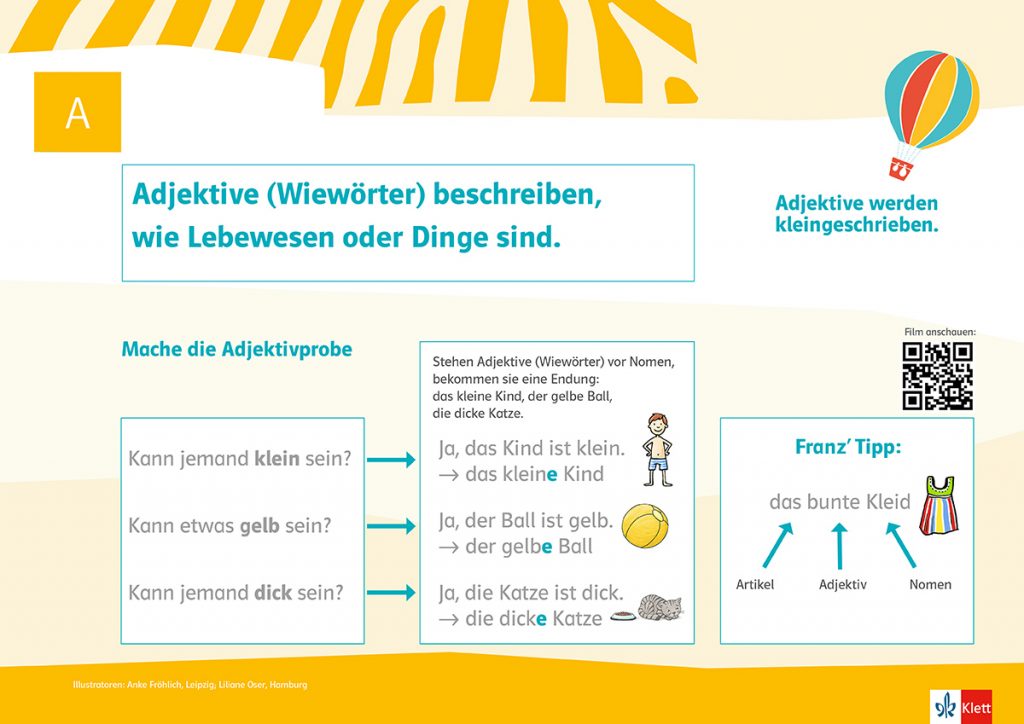 Auf dem Wortartenplakat ist ein QR-Code abgedruckt, mit dem ihr zu dem Erklärfilm „Adjektive“ gelangt. Der Erklärfilm präsentiert anschaulich die Adjektivprobe und kann als Einstieg oder zur Wiederholung genutzt werden. Ihr findet den Film auf dem Digitalen Unterrichtsassistenten „Zebra 2“. Wollt ihr mehr zur Funktion und zum Einsatz des Digitalen Unterrichtsassistenten wissen? Dann klickt hier weiter.