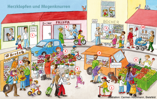 Wie mag sie sich ungeschickt fühlen. Von sich selbst enttäuscht. Sie, die schon groß genug ist zum Einkaufen alleine. Und dann die Blamage, den Geldbeutel zu verlieren! Schon das gibt genug Erzählstoff für die Kinder, die dieses Wimmelbild im Lesebuch betrachten. Das Bild, das alleine beim Anschauen der Marktszene mit den umliegenden Häusern und Geschäften die Kinder einlädt über eigene Erfahrungen zu berichten, dieses Bild wird durch die Lesespurgeschichte noch erweitert.